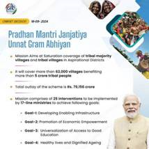 Union Cabinet chaired by the Prime Minister, Shri Narendra Modi, in its meeting on 18th September, 2024 has approved Pradhan Mantri Janjatiya Unnat Gram Abhiyan with a total outlay of Rs.79,156 crore (Central Share: Rs.56,333 crore and State Share: Rs. 22,823 crore) for improving the socio-economic condition of tribal communities, by adopting saturation coverage for tribal families in tribal-majority villages and aspirational districts. This will cover around 63,000 villages benefitting more than 5 crore tribal people. It will cover 549 districts and 2,740 blocks spread across all tribal majority villages across 30 States / UTs.