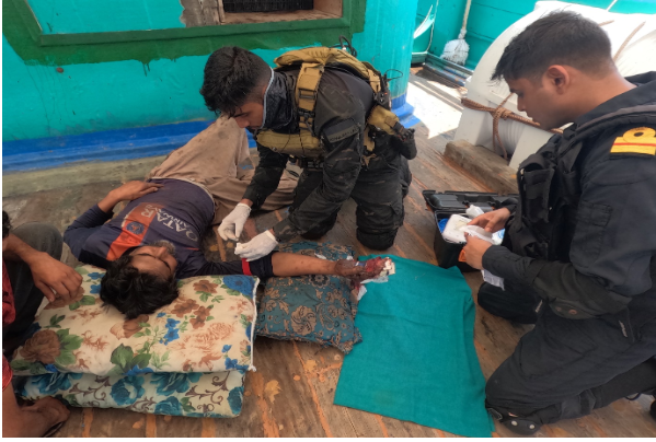 Trikand immediately altered her course to provide medical assistance to the injured crew member. The crew of FV Abdul Rehman Hanzia consisted 11 Pakistani (09 Baloch and 02 Sindhi) and 05 Iranian personnel. The injured individual, a Pakistani (Baloch) national, had suffered multiple fractures and severe hand injuries, resulting in heavy blood loss.